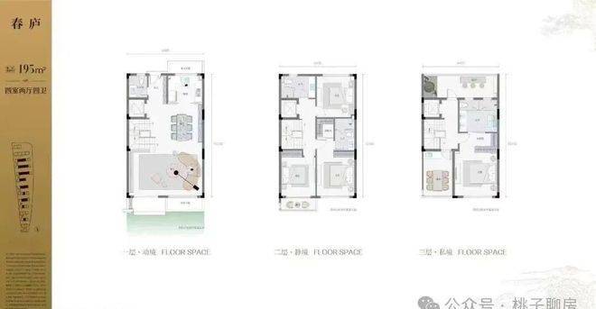 195㎡排屋:4室2厅4卫,地下2层+地上3层,南北双花园设计,层高约5.8米地下室。