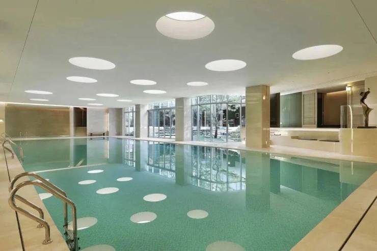 入户大堂的负一层,与下沉庭院相结合,共同组成建面约1200㎡的会所,恒温泳池、健身房、瑜伽空间、童玩区等一一备齐。