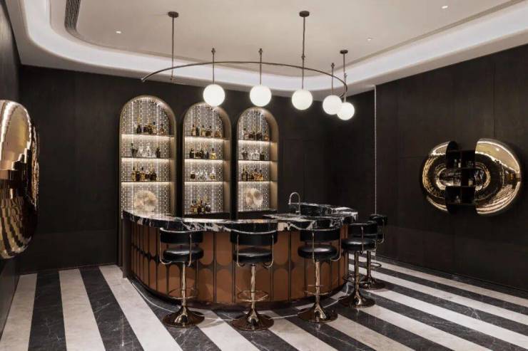 在这方酒吧天地,深色墙域如静谧幕布,弧形吧台似优雅请柬。入座吧台,于明暗交织里,任微醺漫上舌尖,开启独属于夜晚的奢雅沉醉 。
