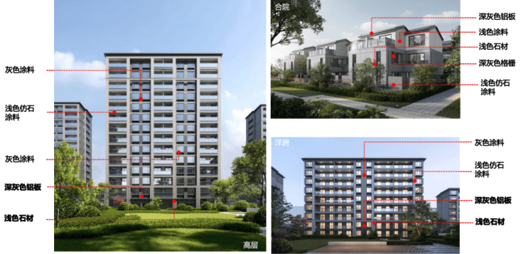 灰白对比的主色调,突出典雅的调性。保留宋式传统元素,并通过大面积玻璃、涂料、首二层石材+铝线条等简洁而现代手法,匹配现代品质生活。