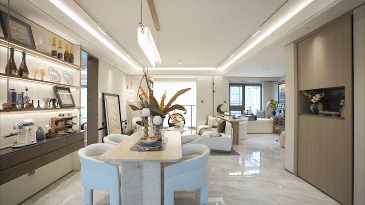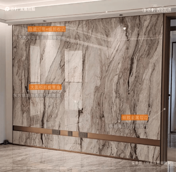 全墙纸交标结合整幅岩板客厅景墙,以定制设计感提升空间立体感。