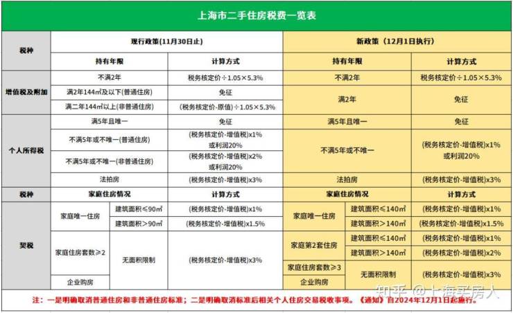 Q:本次新政是否直接取消了普通住房和非普通住房标准?A:本次《关于取消普通住房标准有关事项的通知》,一是明确取消普通住房和非普通住房标准;二是明确取消标准后相关个人住房交易税收事项。《通知》自2024年12月1日起施行。Q:本次取消普通住房和非普通住房标准、满2年免征增值税、契税按照140㎡标准等,以什么时间为执行节点?A:自2024年12月1日起施行。2024年12月1日前,个人销售、购买住房涉及的个人所得税、增值税和契税尚未申报缴纳的,符合规定的也适用执行。Q:增值税由5年调整为2年的这个政策,个人所得税是否也同样调整满2年且唯一免征增值税?A:个人所得税不执行,依然执行的是满5年且唯一才可以免征。Q:居住证➕积分通知书,满三年社保,等同于上海家庭购房政策,那买二套房产房产税房产税是否也享受人均60平米的优惠?A:不享受,按原政策执行,本次政策仅针对购房资质。Q:本次政策调整后,个人出售房屋,个人所得税的缴纳方式有哪些?A:自2024年12月1日起,个人所得税按照(税务核定价-增值税)×1%或利润20%计算征收。利润=本次出售的核定价-【购入的合同价格+购入所缴纳的契税+本次出售的增值税及其附加税+装修费用(≤购入的房屋合同价格的10%)+购房按揭贷款利息】Q:本次政策调整后个人家庭购买第3套及以上住房,契税如何缴纳,限购前和父母共用的是否可剔除?A:个人家庭购买第三套住房及以上的,契税税率按3%征收;限购政策前同父母共有住房,在计算契税时不予剔除套数。