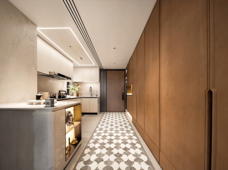 走进海上·清和玺的厨房,墙面岩板通铺,视觉效果超棒。