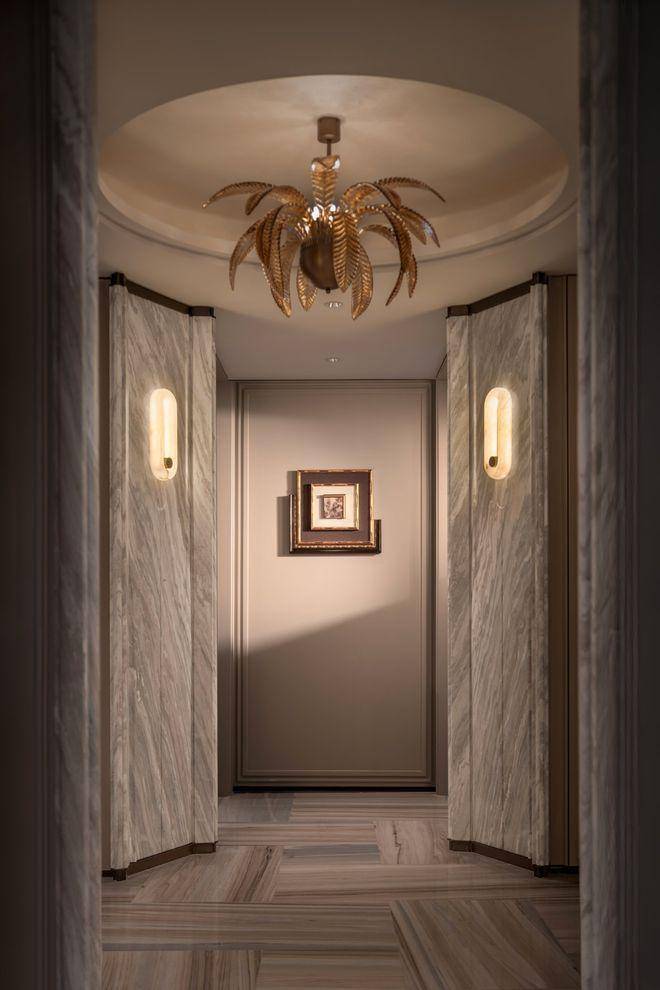 经典十字序列厅:从私享电梯厅开始,经由对开入户门,首先就进入这样一个十字序列厅,视线远处,就是尽头观景台,这条长廊,可以是公私分区的交通枢纽,也可以是彰显主人品味的艺术长廊;