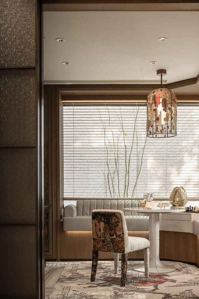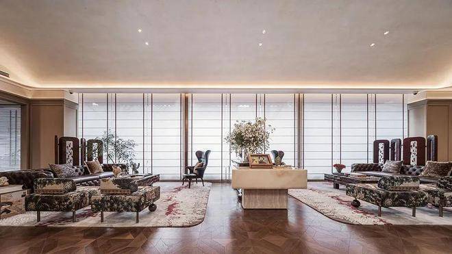 约17.2米环绕观景台:约238㎡户型的客餐厅,位于户型的顶端。自东向南环绕270度的观景台长达约17.2米,在这样的客厅,甚至可以踱步欣赏窗外的满眼梧桐。独立会客厅,可以做小茶室或棋牌,更深一步的隐私感,为专享客群定制。