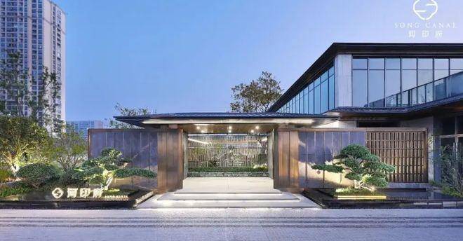 设计美学:融合宋式东方美学,立面采用白色石材与金色勾边,搭配宽屏窗墙比,营造轻盈无界的当代风格