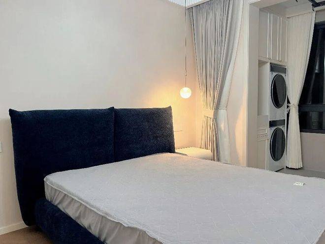 另一间卧室则以深墨绿软包床头碰撞浅灰床品,沉稳又耐看,球形吊灯的暖光落在床面,搭配简约白纱帘,营造出安静助眠的氛围。嵌入式收纳柜与洗衣区巧妙融合,既满足实用需求,又保持了空间的整洁通透,无论是自住还是待客,都能感受到松弛的舒适感。