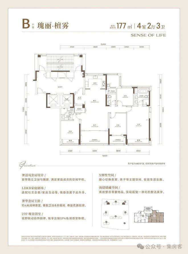 建面约177㎡的四房,保持四开间南的格局,但尺度进一步拉大,将阳台包入之后,整个LDKB公区会放大到约40㎡。
