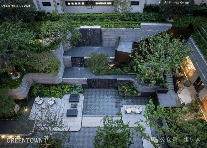 “层林叠院”解构弗兰克·劳埃德·赖特“流水别墅”精髓,三阶跌水倾泻而下。台地花园有序排布,红枫、斜飘紫薇等绿植营造四季景致。阶梯步道、休憩空间巧妙设置,景随人移,随自然渐入沉浸。