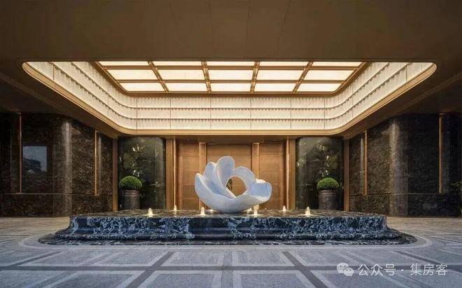 如山茶花般的定制石雕,映衬厚重的朱氏铜门,配上两侧大面荷塘月色奢石、铂金钻石材景墙,远远望去,宛如歌剧开幕时垂坠的天鹅绒帷幔,打开归家的仪式感。
