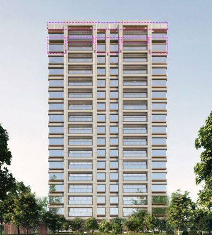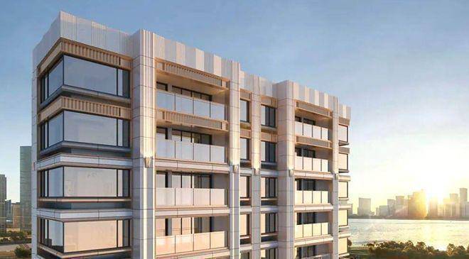 立面结构采用西方古典建筑经典制式“横三竖五”进行立面切分,如基座、中段、塔冠分为三段式,竖向阳台、飘窗分为五段式,极致中轴对称。设计以承载美为出发点,采用纯粹和质朴的空间和材质,从古典形态中提炼出简洁而有力的符号,强化了建筑的形式感和空间感。