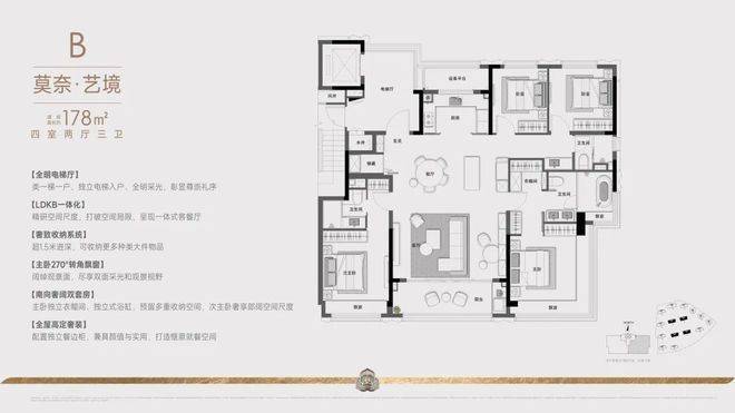 建面约178方四房两厅三卫:这款户型,则站在追求品质改善人群的角度,做出了四房三卫双主套设计。主卧与次卧均为南向套房,两代人生活平权,尊重每一位家人的「私域空间」和「阳光平权」,很多房企都做不到。还配置进深超1.5米的储藏空间,兼顾日常生活的方方面面。
