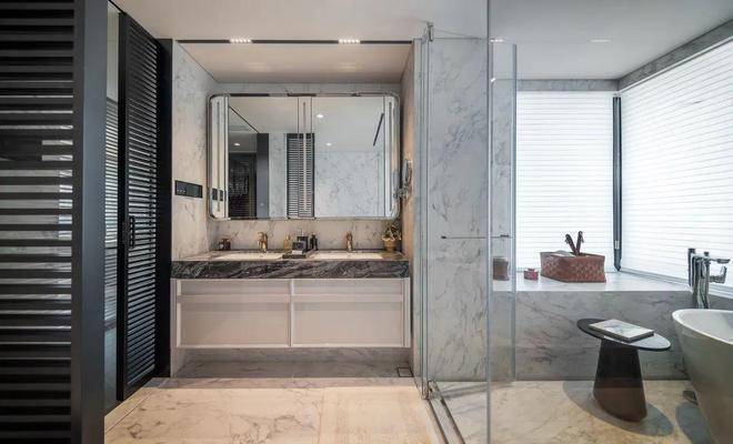 如三大件用的是华宅必备的全屋智能家居,日立两联供的中央空调、地暖,法国爱迪士的新风;厨房用的是博世四件套(燃气灶、吸油烟机、洗碗机、蒸烤一体机),2个东芝嵌入式冰箱,并额外配置3个拉篮;主卧还有日本皇家特供的伊奈智能马桶,沄璟主卫做了杜拉维特双台盆,再铺上威尼斯棕的台面,干净整洁的同时,也有美学视觉体验。