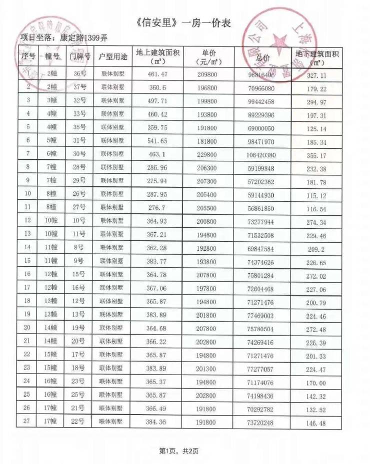 风貌别墅 一房一价表: