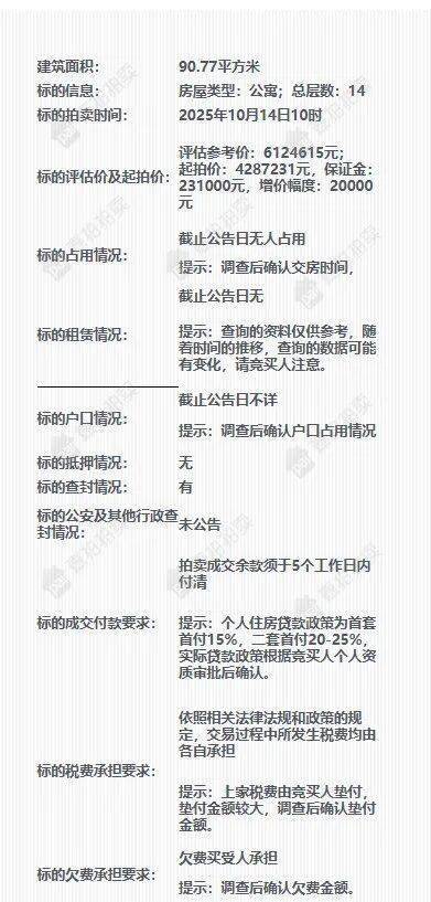 法拍房:66套房源将于2025年10月13日拍卖,起拍价较市场价低约30%。