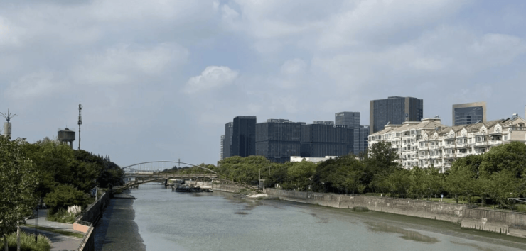站在河岸远眺,左侧莘庄商务区天际线尽收眼底,世宏金源中心、旭辉莘庄中心、西子国际、中铁华东总部、中铁诺德、AFC大虹桥国际等,向右则是淀浦河桥,听附近居民说这一带夜景尤为迷人。