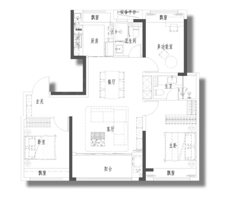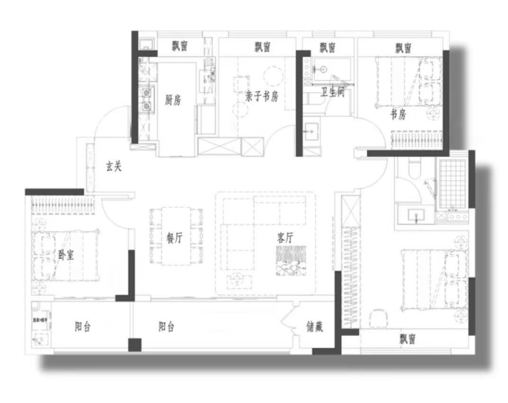 全卧飘窗,北房间以及南向次卧飘窗没有墙垛,利用率更高。