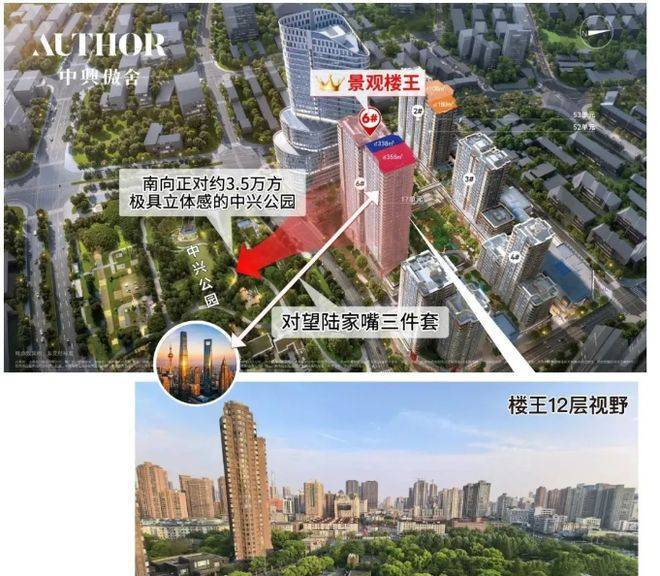 大户型稀缺景观:180㎡及以上户型享270°弧形观景阳台,楼王产品(338-355㎡)南瞰中兴公园、北望森感景观,对望陆家嘴天际线
