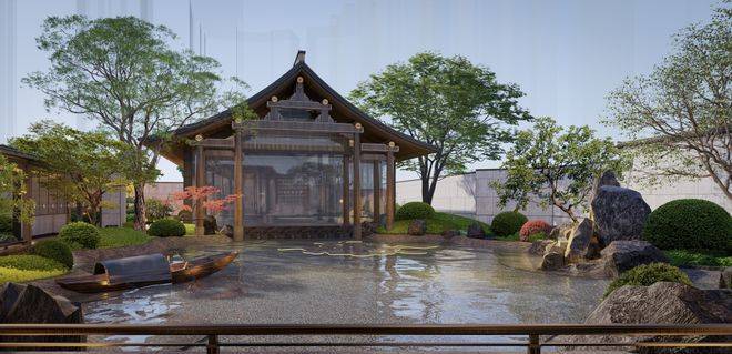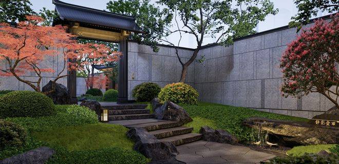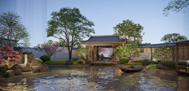 云城之上的园林是府邸大门三进后的整体延伸,是真正的中式园林,有假山、水榭、小桥、流水、景墙、连廊,活脱脱的一座古色古香的江南园林。