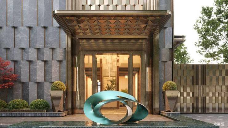 地面延续酒店式落客区海棠纹拼花镶钻,铁打纹工艺,其间还有老石板,青石板,中国黑老石皮,柏坡黄的石皮等原石原面铺装,老石皮从大料里取出,数量少而贵,由此也可看出保利·永兴里在别墅打造上是真舍得,也是真高级。