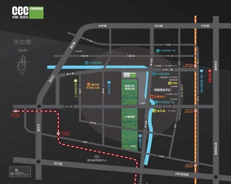项目南起新村路,西侧紧邻中央森林带;北至富水路,东临真华路交界处。北部和东部分别被横港河和龙珍港包围,形成天然的半岛状;两条天然河流和中央森林带成就了上海最适宜居住的地段之一。
