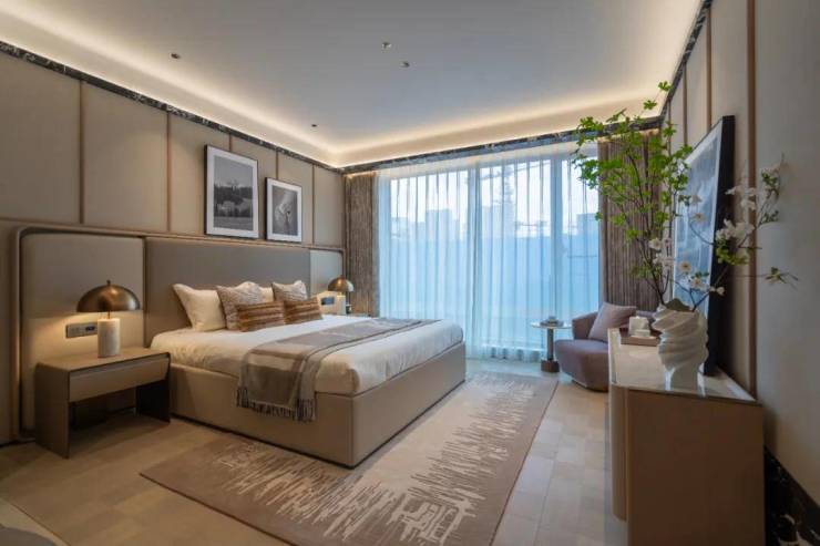 每一个卧室,则是都拥有专属的背景墙,珍珠鱼皮与香奈儿格纹材质的搭配、菲律宾贝母手工工艺,还有麂皮纹、编织皮革等用材,都出现在了不同的卧室背景墙上……明知道这样做的成本更高、豪宅更多,但是依然坚持,为的就是给予业主更美观的享受。