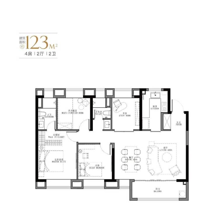 产品:103㎡、107㎡的三房两厅两卫及123㎡、129㎡的四房两厅两卫