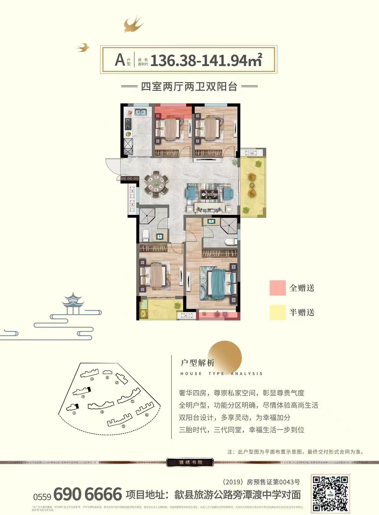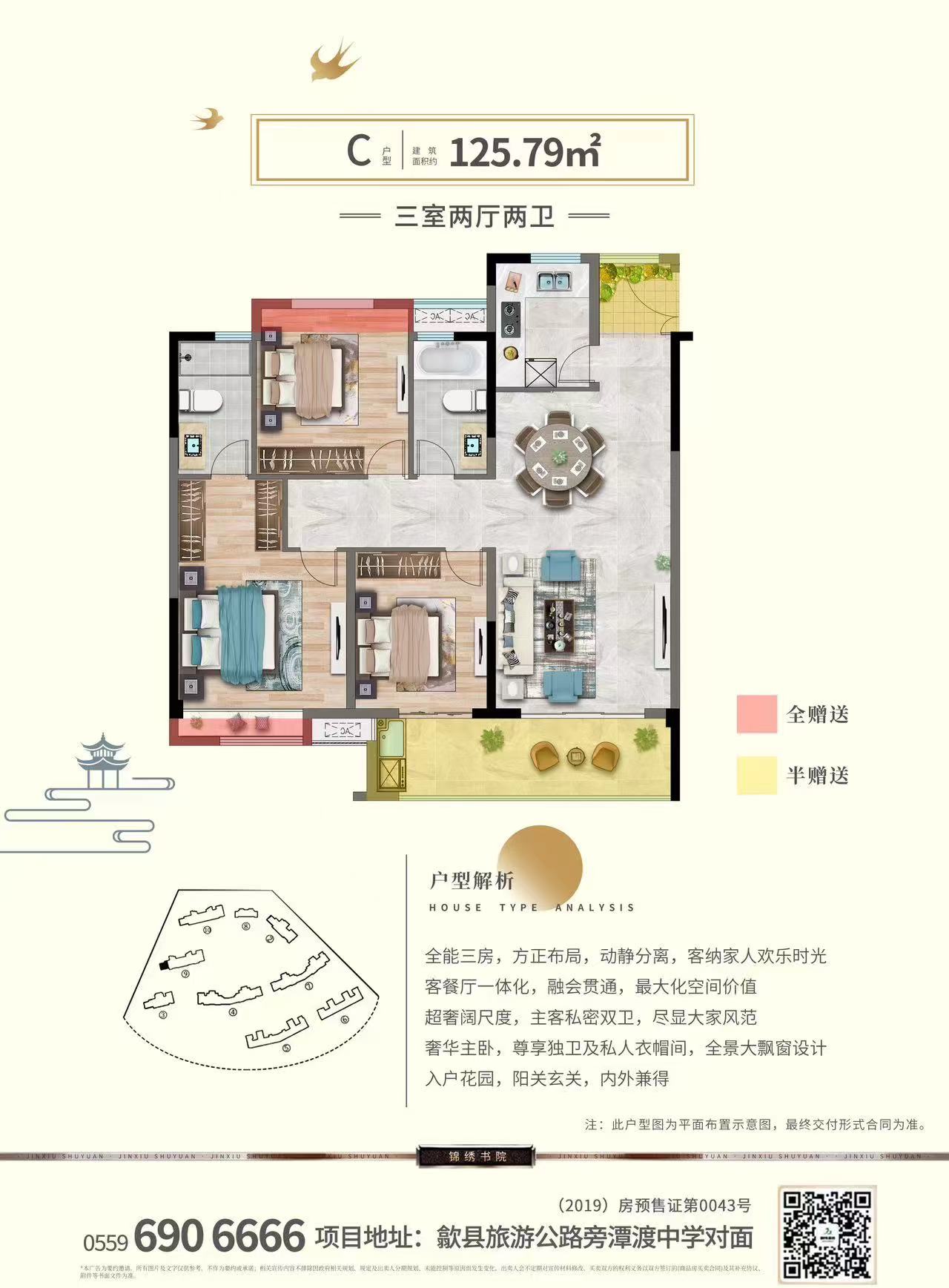 安地·锦绣书院规划100余亩的徽州院落文化体验区和140多席别墅以及8栋近800户的高端文创园公寓。项目周边集小学、中学、高中学校多处,教育资源优厚,交通便利。