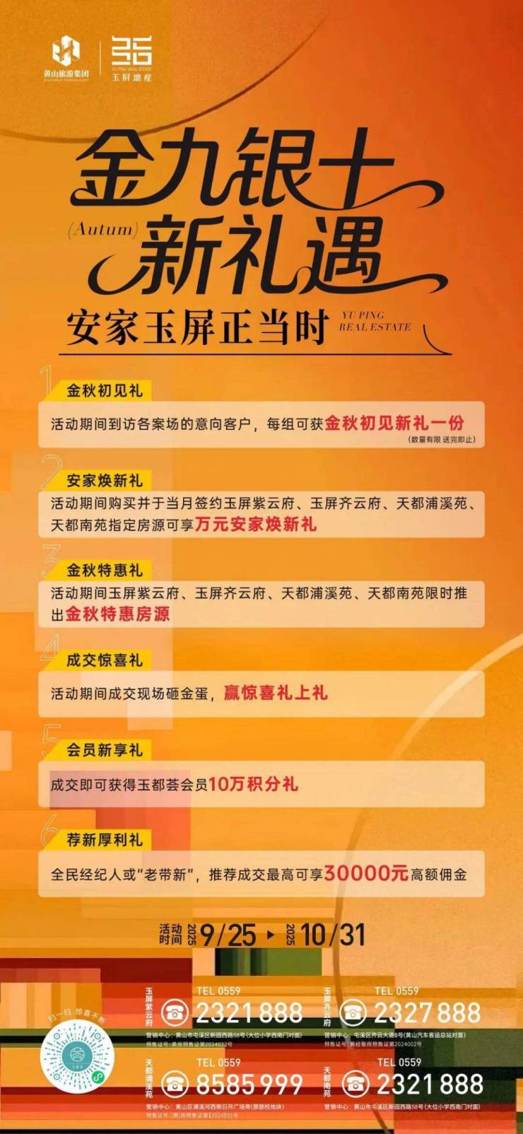 3.金秋特惠礼:活动期间玉屏紫云府、玉屏齐云府、天都浦溪苑、天都南苑限时推出金秋特惠房源