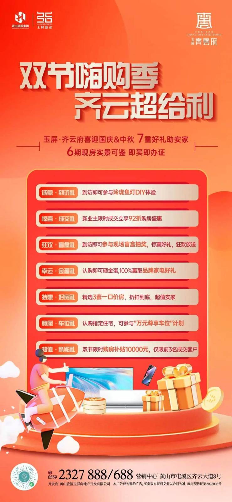 2.安家焕新礼:活动期间购买并于当月签约玉屏紫云府、玉屏齐云府、天都浦溪苑、天都南苑指定房源可享万元安家焕新礼