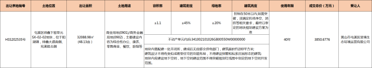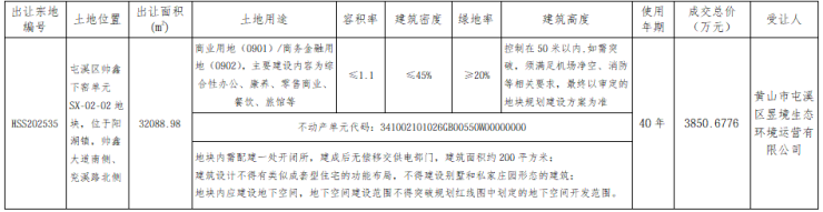 2026年1月23日,屯溪区帅鑫下窖单元SX-02-02地块成功出让,由黄山市屯溪区昱境生态环境运营有限公司竞得。地块位于阳湖镇,帅鑫大道南侧、兖溪路北侧,土地性质为商业用地/商务金融用地,成交面积32088.98㎡(48.13亩),成交总价:3850.6776万元,成交单价:80万元/亩(1200元/㎡),成交楼面地价:1090.9元/㎡。容积率R≤1.1。