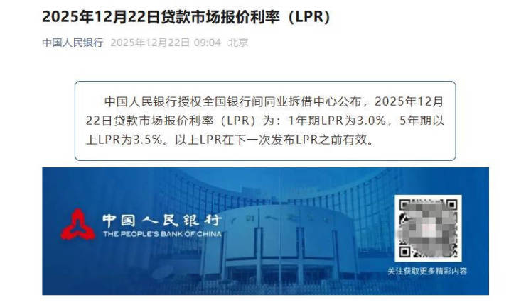 中国人民银行授权全国银行间同业拆借中心公布,2025年12月22日贷款市场报价利率(LPR)为:1年期LPR为3.0%,5年期以上LPR为3.5%。以上LPR在下一次发布LPR之前有效。