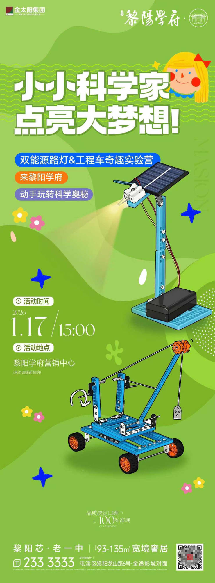 小小科学家,点亮大梦想!1月17日,黎阳学府双能源路灯&工程车奇趣实验营,等你一起来玩转科学奥秘。活动地点:黎阳学府营销中心