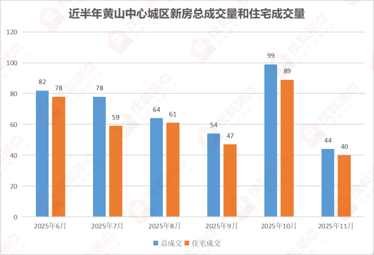 2025年11月黄山中心城区新房共成交44套,环比10月的99套,减少55套,下降56%;同比去年11月的95套,减少51套,下降54%。