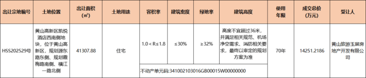 2025年11月,黄山高新区凯悦酒店西南侧住宅地块成功出让,由黄山旅游玉屏房地产开发有限公司竞得。出让总面积41307.88平方米(合61.96亩),成交总价14251.2186万元,成交单价3450元/㎡(230万元/亩),成交楼面地价1916.67元/㎡,容积率1.0<R≤1.8。