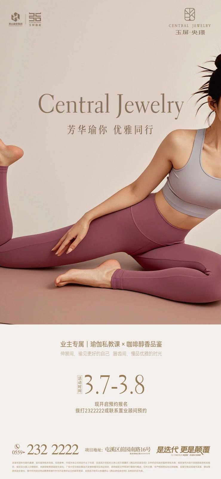 芳华瑜你 优雅同行 3月7日-8日,玉屏·央璟业主专属瑜伽私教课开启预约,咖啡醇香品鉴伸展间,瑜见更好的自己 唇齿间,慢品优雅的时光。预约报名拨打2322222或联系置业顾问预约