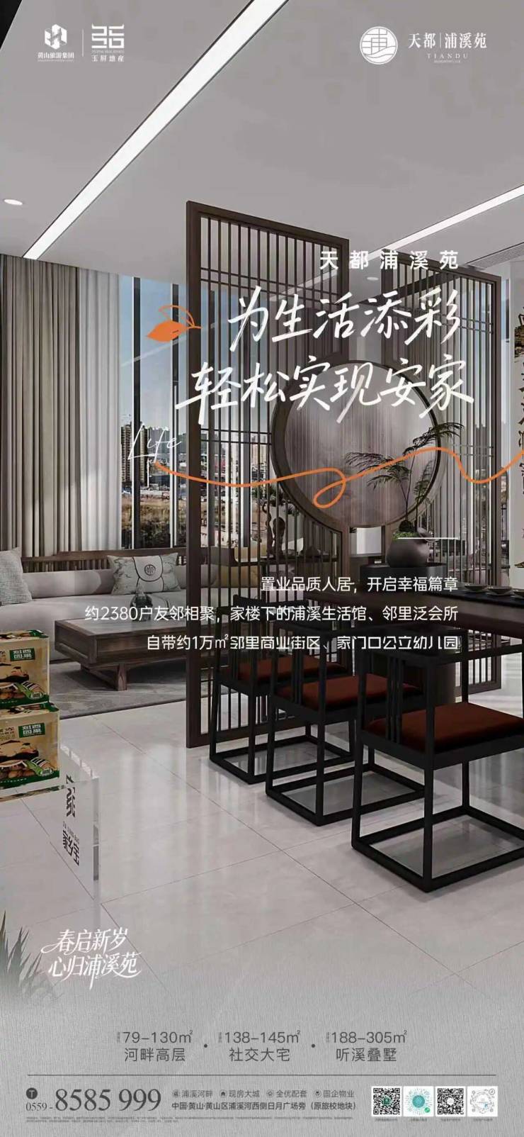 春启新岁,心归浦溪苑。天都浦溪苑建面约79-130㎡河畔高层、138-145㎡社交大宅、188-305㎡听溪叠墅实景现房臻席热售中。