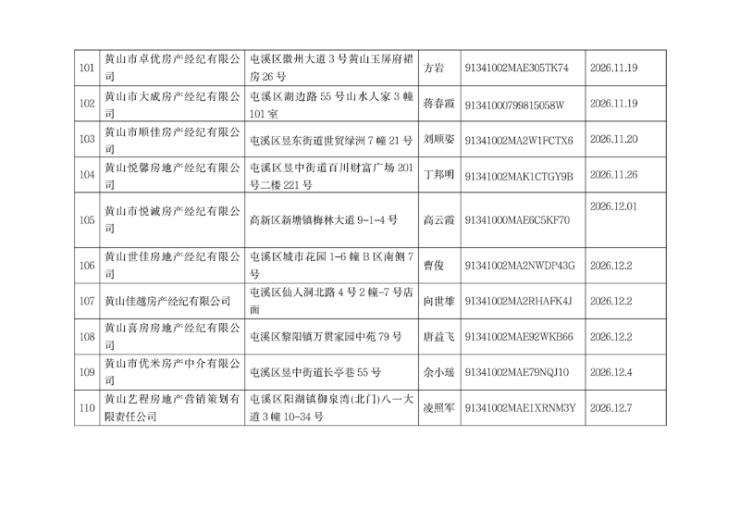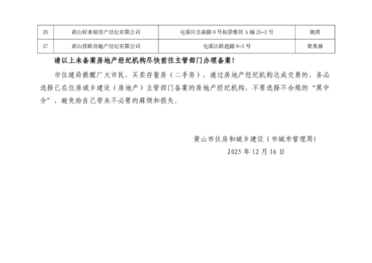 黄山市中心城区房地产经纪机构备案情况公示