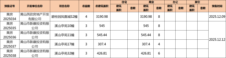 2025年12月,黄山中心城区碧桂园凤凰城、溪山亭苑2盘获预售证,新增可预售商业34套,新增可预售面积5015.63㎡。