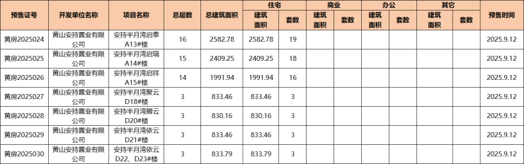 9月,黄山中心城区安持半月湾1盘获预售证,新增可预售住宅房源65套,新增可预售住宅面积10314.84㎡。
