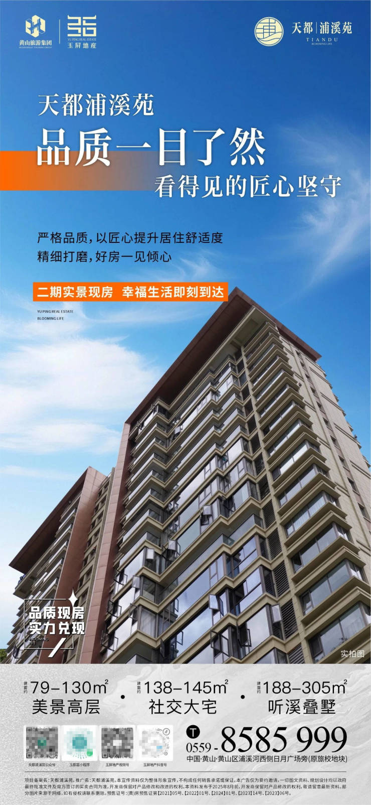为爱安家 国企全景现房。天都浦溪苑建面约79 - 130㎡的美景高层,138 - 145㎡社交大宅,188 - 305㎡听溪叠墅热售中。