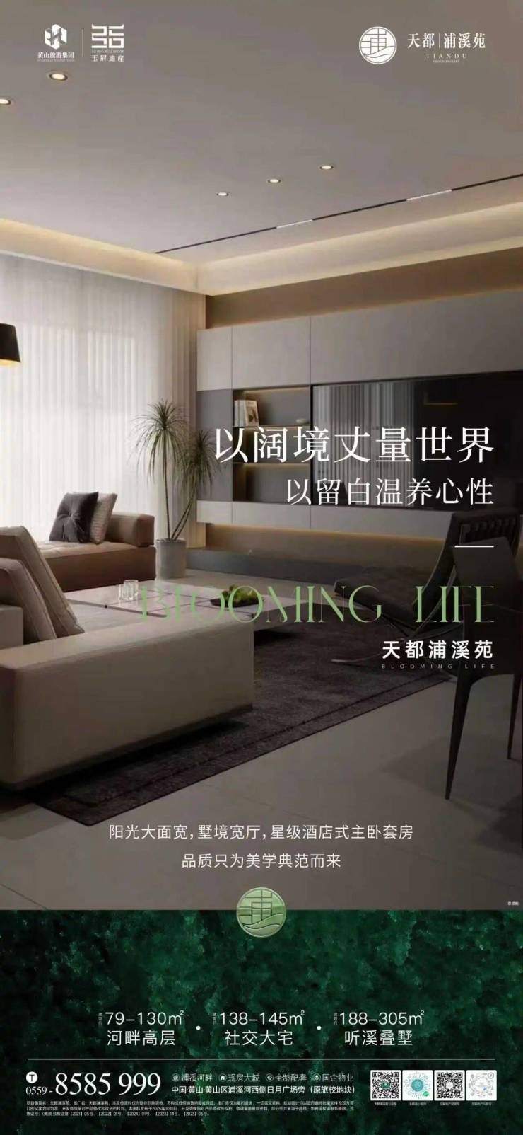 以阔境丈量世界,以留白温养心性。天都浦溪苑,阳光大面宽,墅境宽厅,星级酒店式主卧套房,品质只为美学典范而来。