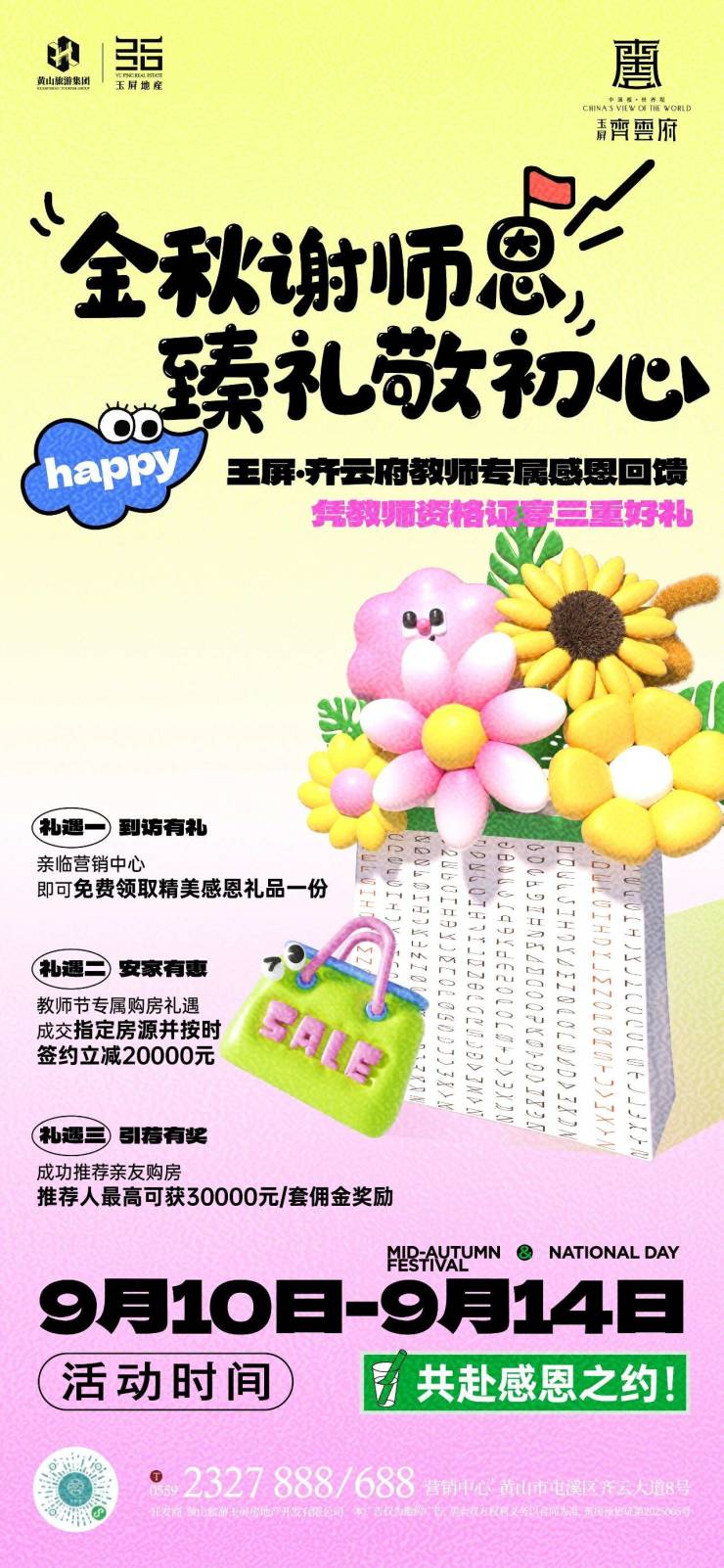 金秋购房季,安家超给利。玉屏齐云府教师专属感恩回馈,凭教师资格证享受三重好礼,活动时间截止至9月15日。