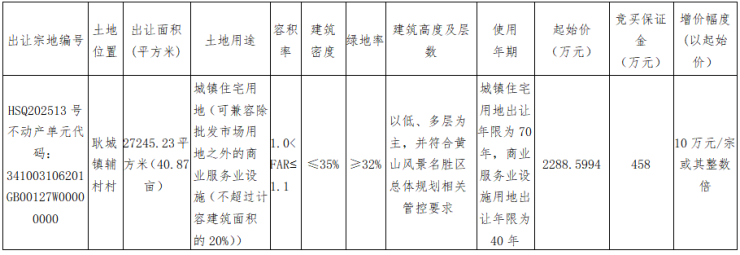 2025年12月22日,黄山区耿城镇辅村村HSQ202513 号地块挂牌,土地性质为商住用地,出让面积27245.23㎡(合40.87亩),起拍总价:2288.5994万元,起拍单价:840元/㎡,起拍楼面地价:763.6元/㎡。容积率1.0<R<1.1。城镇住宅用地(可兼容除批发市场用地之外的商业服务业设施(不超过计容建筑面积的 20%))。拍卖时间:2026年1月21日。