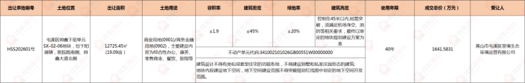 屯溪区帅鑫下窑单元SX-02-06商业地块(宗地编号:HSS202601号)成功出让,由黄山市屯溪区昱境生态环境运营有限公司底价竞得,成交总价1641.5831万元,成交单价86万元/亩(1290元/㎡),成交楼面地价678.9元/㎡。