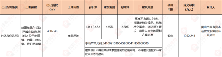 黄山市国有资本运营控股集团有限公司底价黄山中心城区新潭单元东关路(西峰山路)东侧商业地块(宗地编号:HSS202532号),成交总价1292.244万元,成交单价3000元/㎡(200万元/亩),成交楼面地价1250元/㎡。