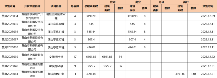 2025年12月,黄山中心城区碧桂园凤凰城、溪山亭苑、安澜轩、徽玖府4盘获预售证,新增可预售住宅房源70套。