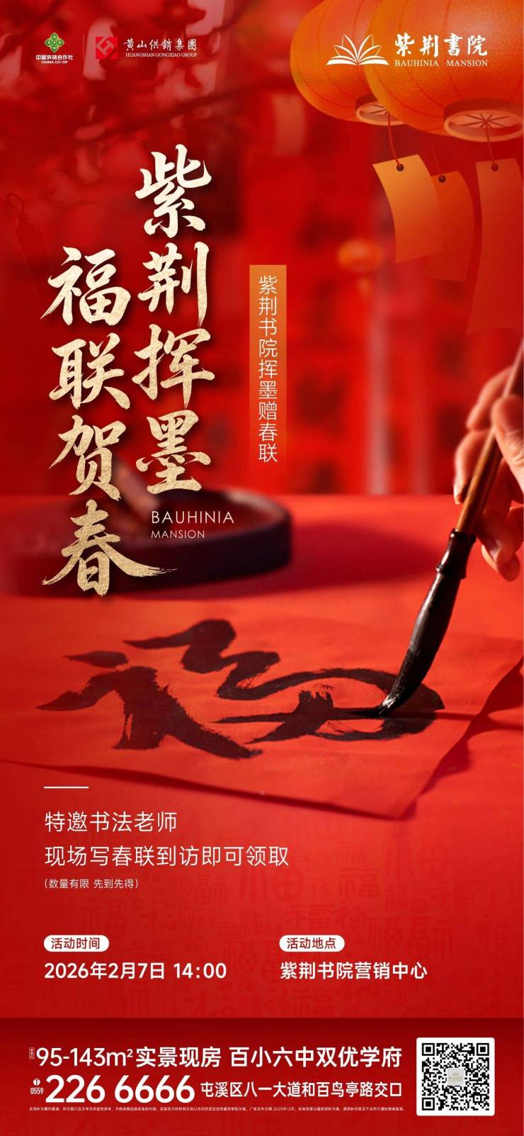紫荆挥墨,福联贺春!紫荆书院特邀书法老师现场写春联,到访即可领取(数量有限先到先得)。活动时间:2026年2月7日 14:00;活动地点:紫荆书院营销中心