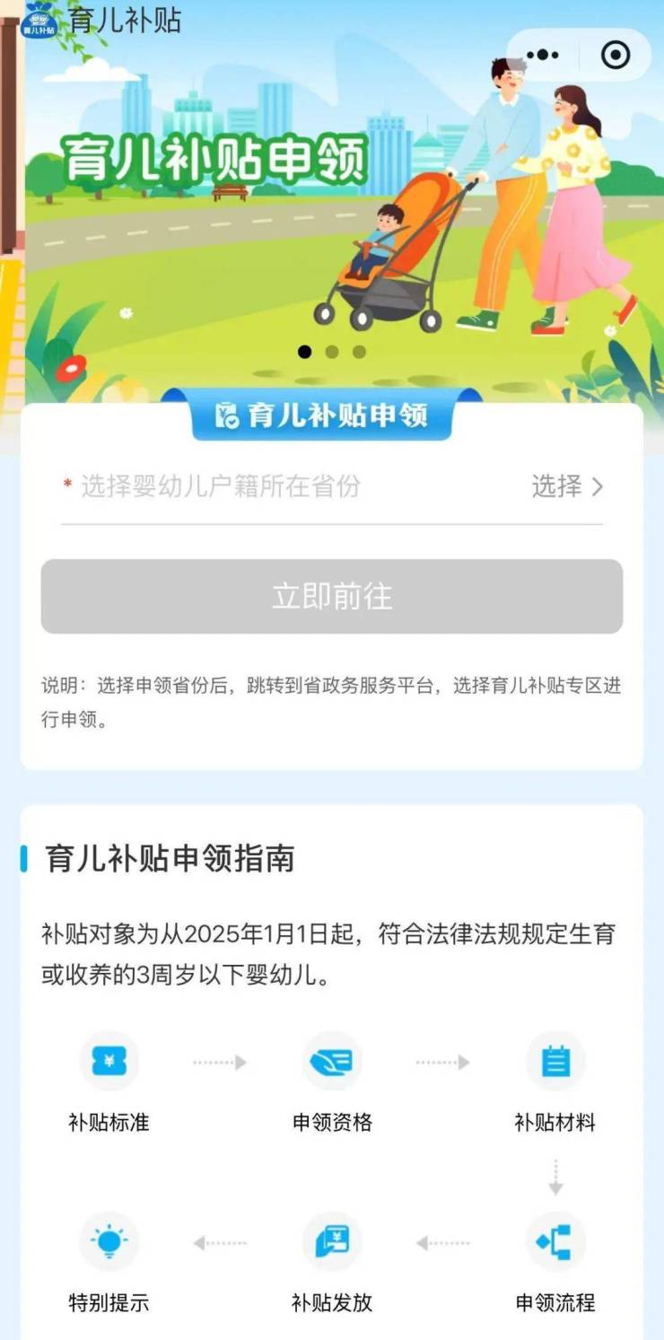 微信小程序“育儿补贴”目前暂未开放申领,待正式开放后,在小程序首页输入婴幼儿户籍所在省份,即可跳转至官方政务服务平台,申请领取育儿补贴。