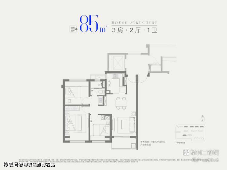 85㎡三房一卫(二/三期):总价320万起,两梯四户(有连廊),户型方正全明,南北通透,三开间朝南+短进深,采光通风俱佳,适配新婚家庭或三口之家。